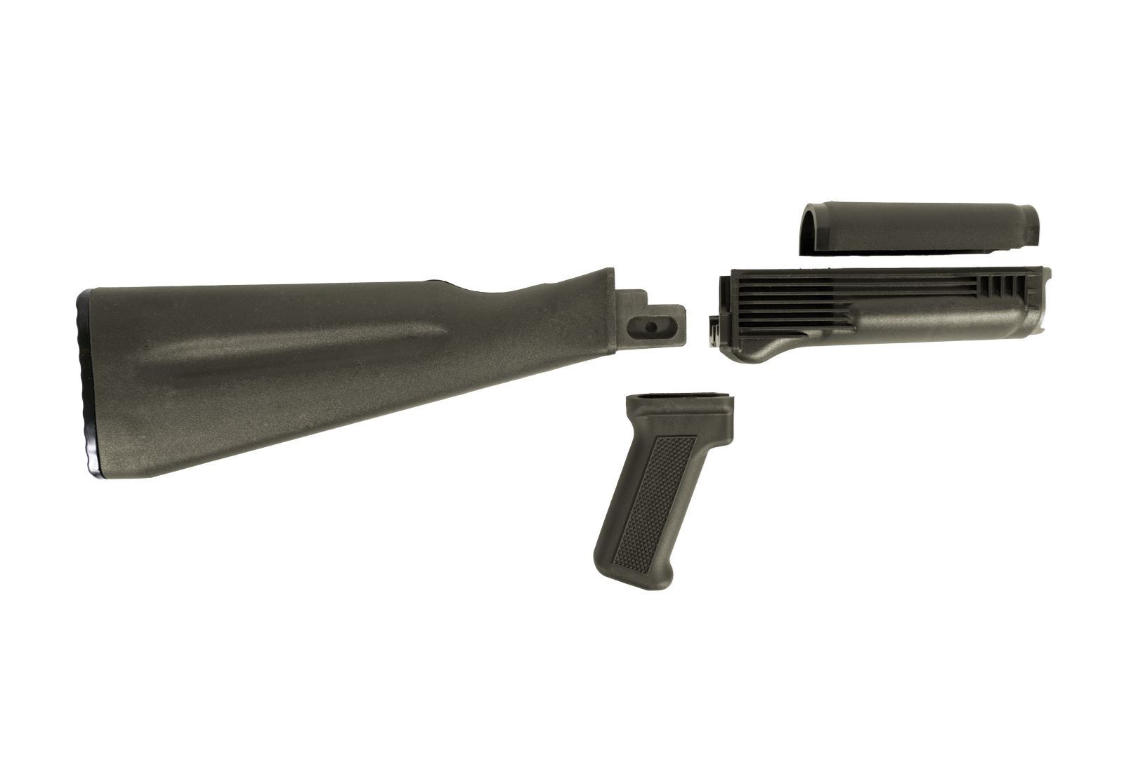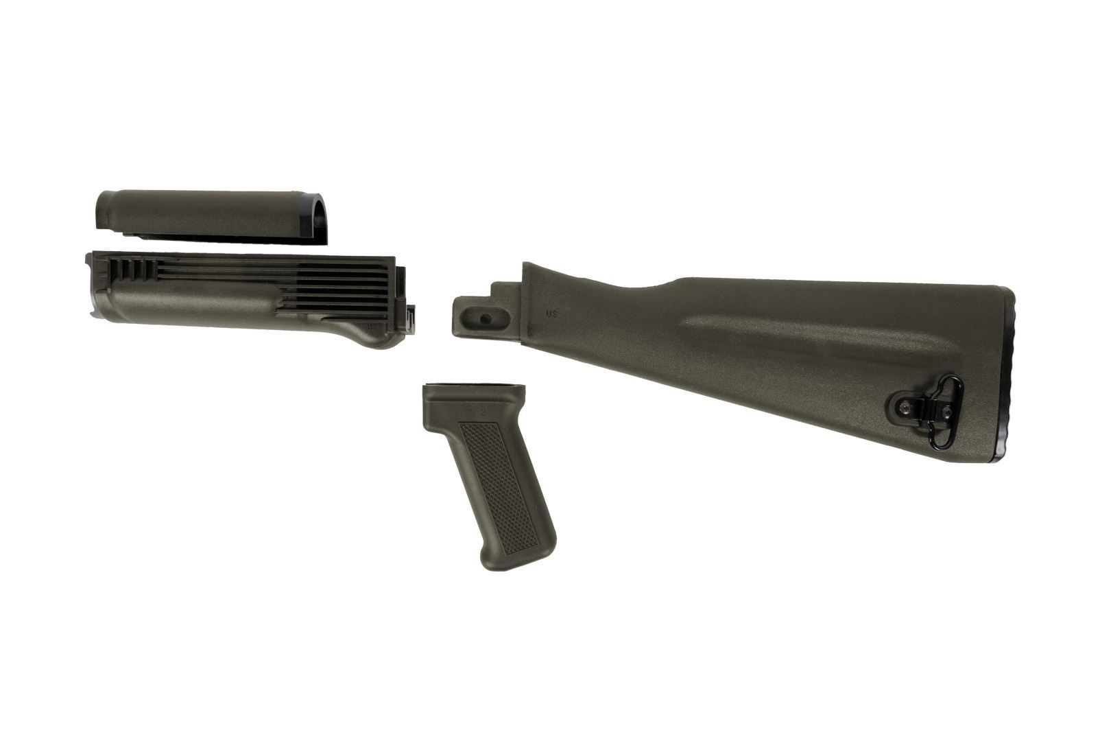 Four-piece US made mil-spec stock set. Warsaw Pact length glass reinforced polymer buttstock for stamped receivers in OD Green color. The lower handguard features stainless steel heat shield. The buttstock is assembled with US made bind free sling swivel and features spring loaded trap door and compartment for the cleaning kit. Available in additional colors: Desert Sand Black and Plum.Â