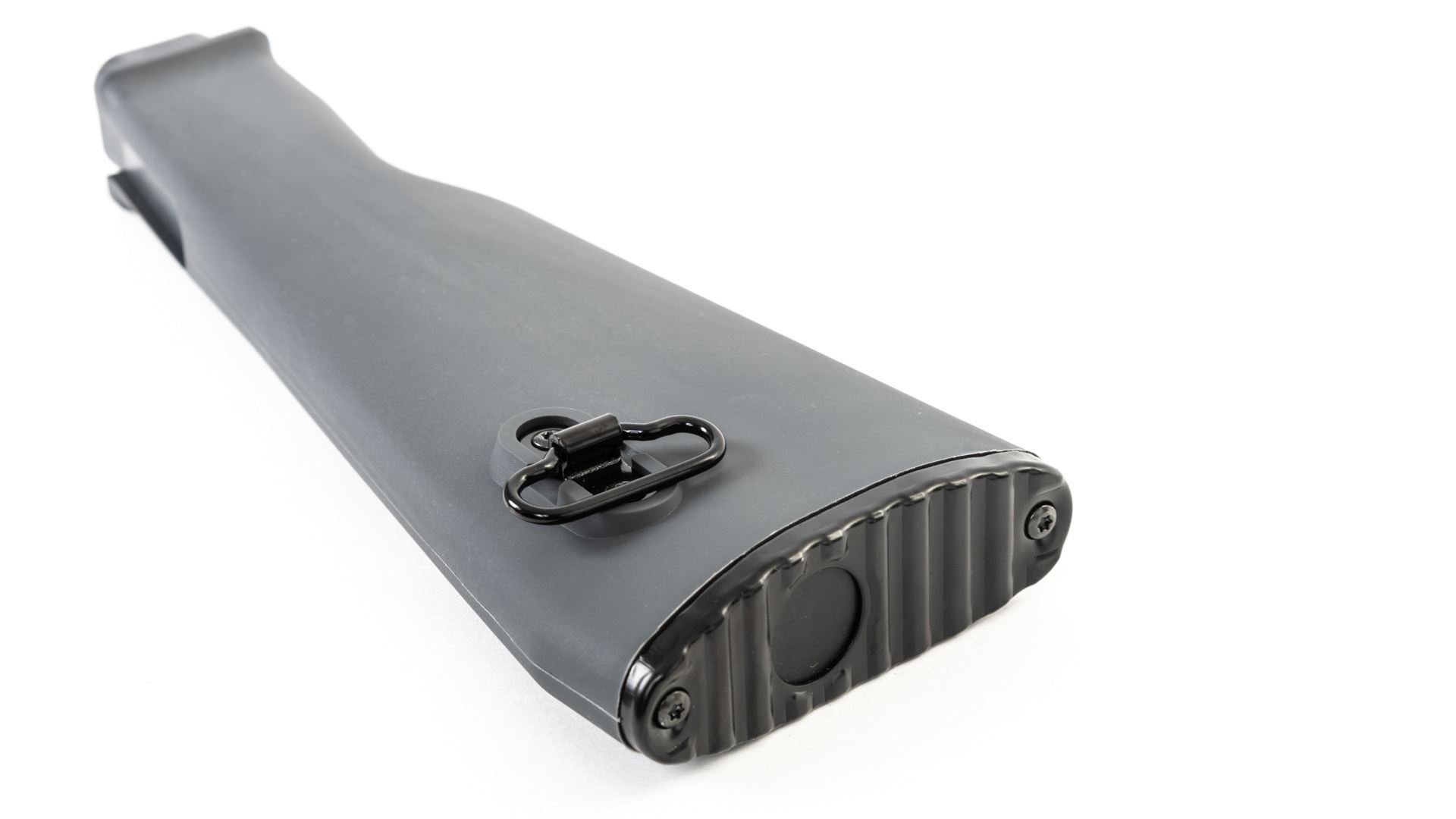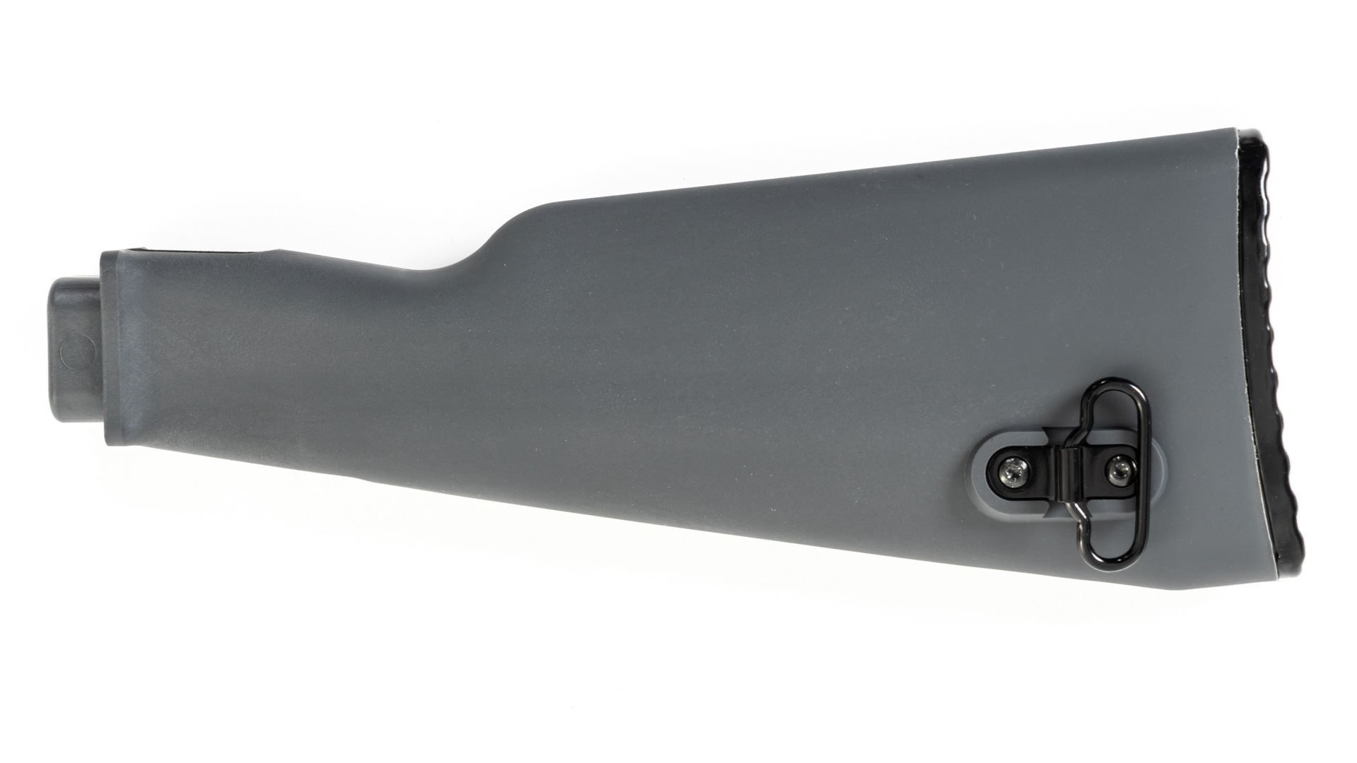 Gray polymer buttstock for milled receiver intermediate length with trap door for cleaning kit compartment. USA manufactured by Arsenal Inc.