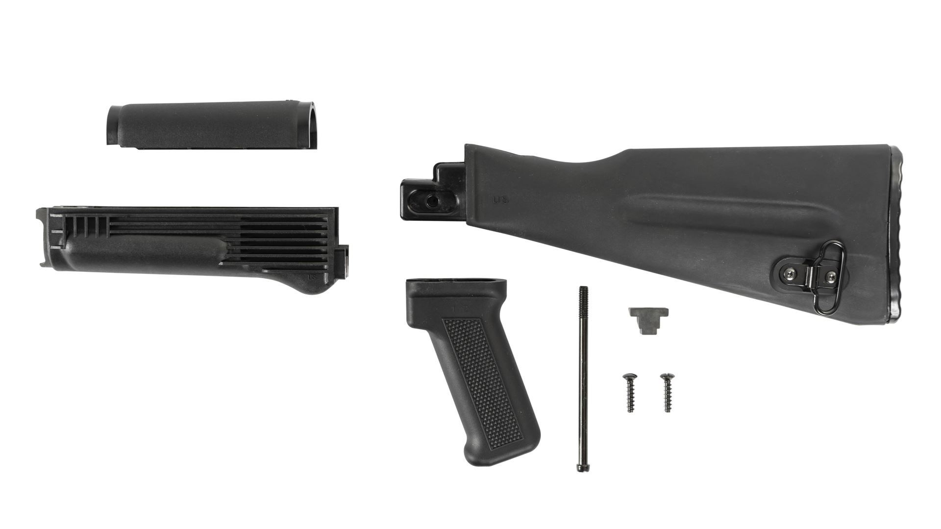 Our own U.S. made Black Polymer Stock Set Warsaw Pact length buttstock for stamped receivers. Equipped with a stainless steel heat shield. 1 –Â AK-NSK Pistol Grip screw and threaded nut. 2Â AK-034LP – Screw ~ for attaching the Polymer Buttstock.Â