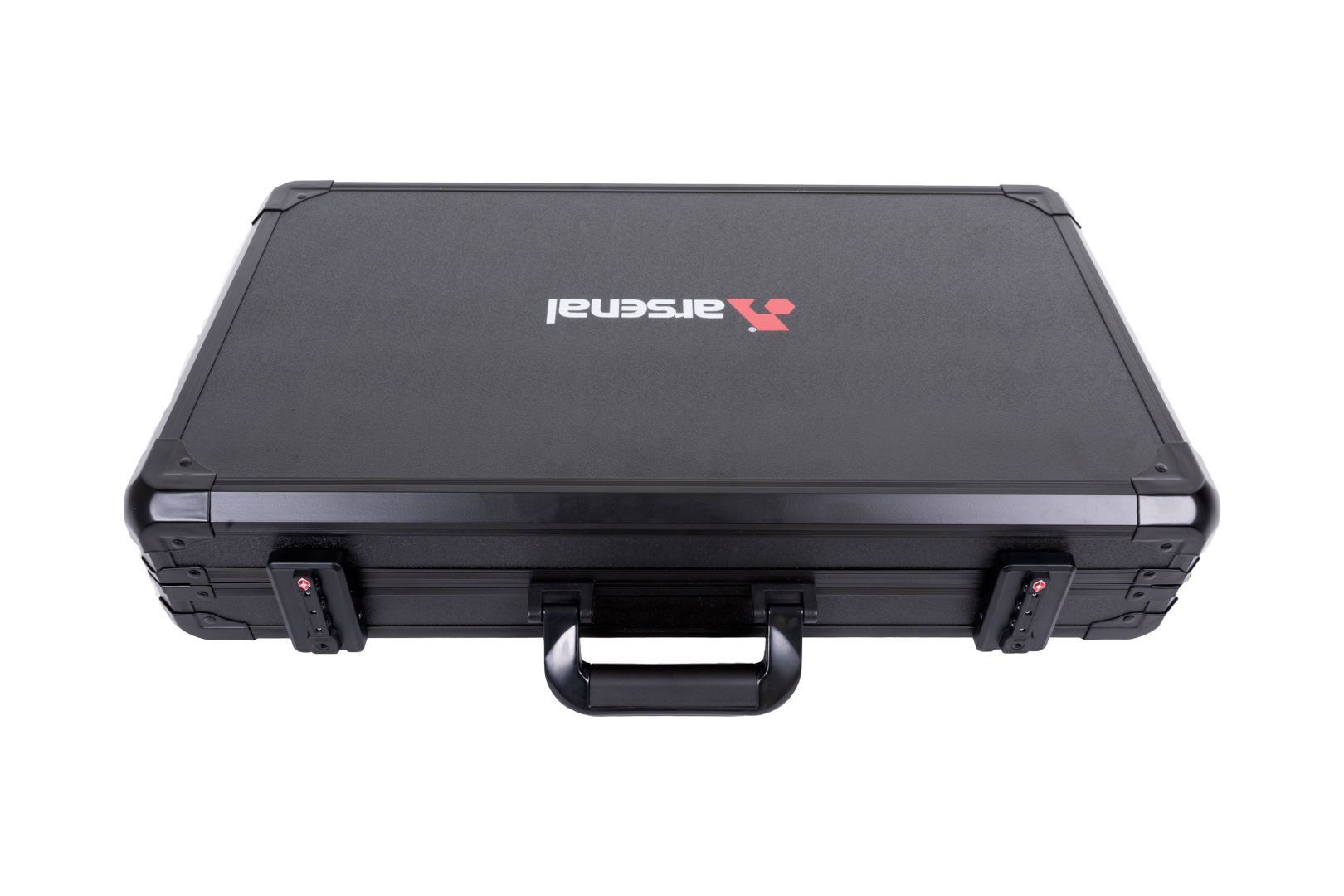 The case is fabricated with aluminum reinforced corners and edges to maximize impact resistance. The combination locks include TSA locks to ensure compliance with TSA regulations. The Arsenal logo is proudly displayed on the top of the case.